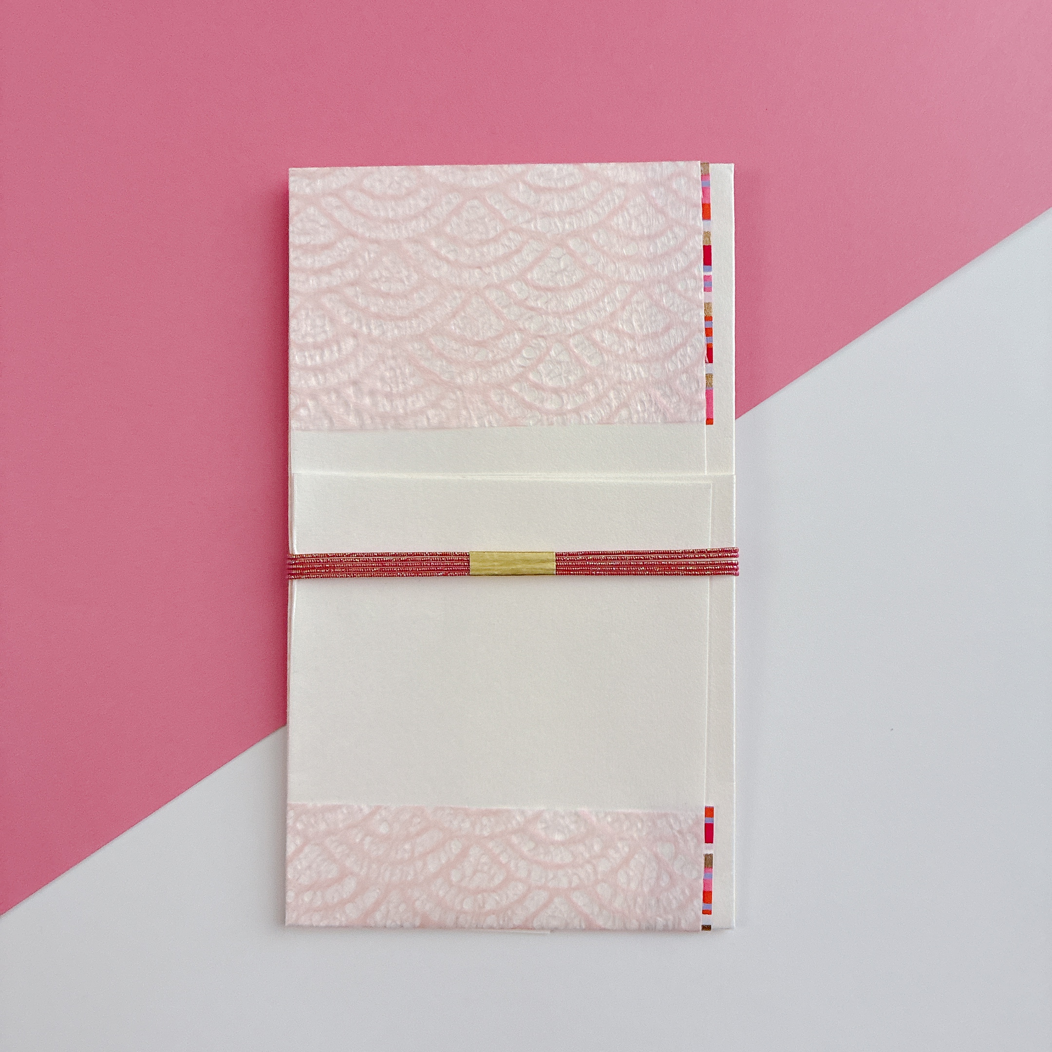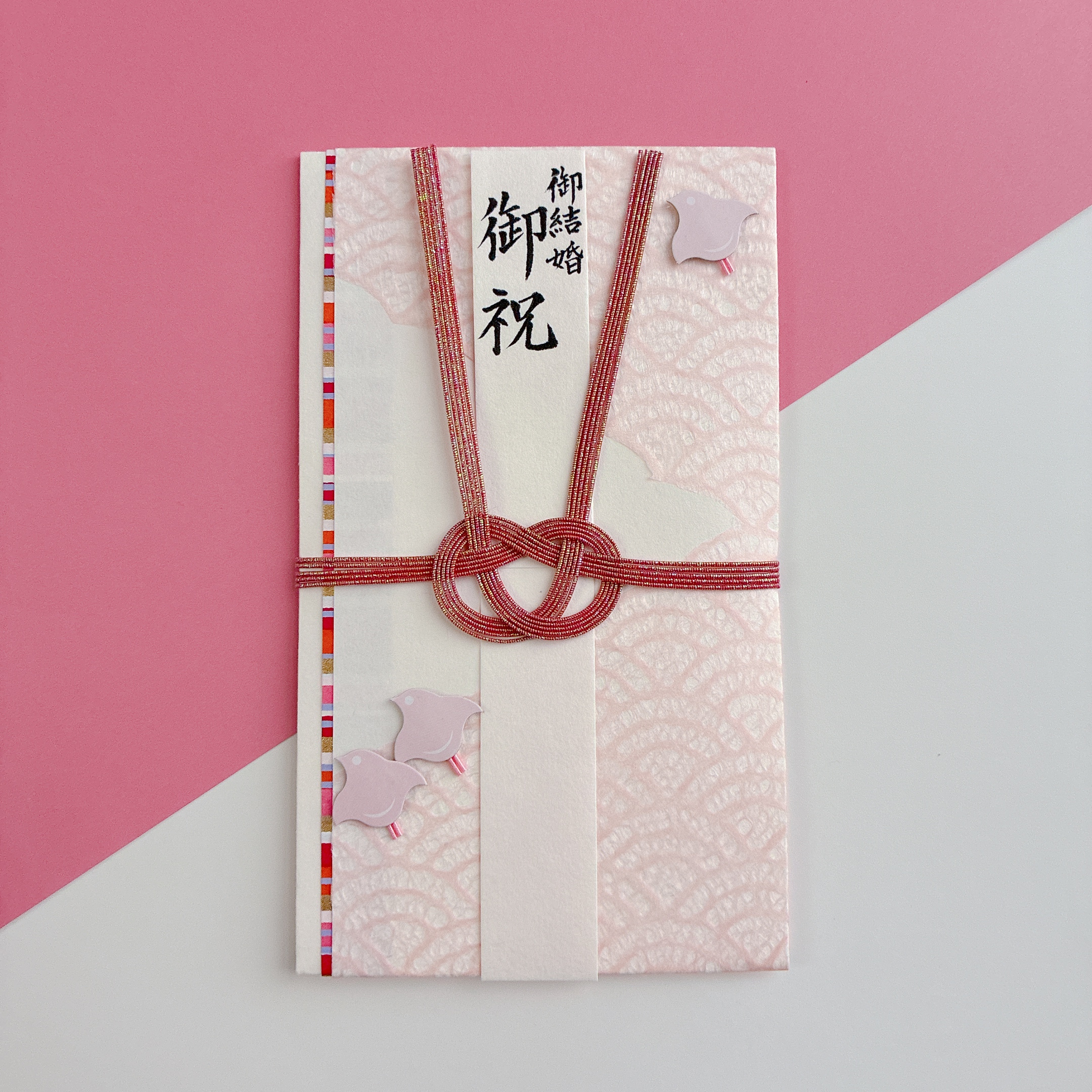薄ピンクの鳥が可愛い、コットン和紙に青海波柄の土佐和紙を重ねた御祝儀袋です。